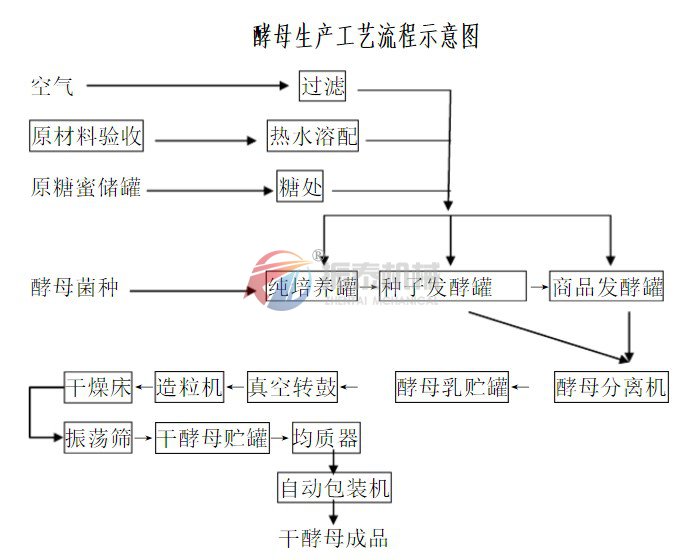實(shí)驗(yàn)室→純培養(yǎng)→種子培養(yǎng)→商品酵母培養(yǎng)→離心機(jī)分離→酵母乳冷藏→壓榨→鮮酵母→造粒→干燥→包裝→倉(cāng)儲(chǔ)