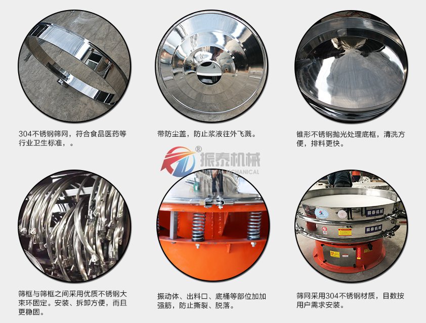 一、該振動(dòng)篩為直徑0.8米,三層四個(gè)出口的振動(dòng)篩,該三層振動(dòng)篩用上下三張不銹鋼篩網(wǎng),三層振動(dòng)篩上層的篩網(wǎng)目數(shù)比較粗,下層的目數(shù)細(xì),可根據(jù)客戶的需要裝(2-500目),兩層振動(dòng)篩型號(hào)有:600、800、1000、1200、1500、1800、建議篩機(jī)使用三層以下。該兩層振動(dòng)篩與物料接觸部分為304不銹鋼材質(zhì),下半部分為碳鋼材質(zhì)。兩層振動(dòng)篩體上方裝防塵罩,不會(huì)產(chǎn)生粉塵飛揚(yáng),有利于環(huán)保。振動(dòng)篩也稱為旋振篩、三次元振動(dòng)篩、振動(dòng)篩分機(jī)、圓形振動(dòng)篩、篩粉機(jī)。