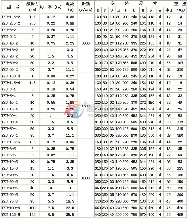 YZU振動(dòng)電機(jī)技術(shù)參數(shù):