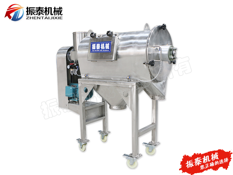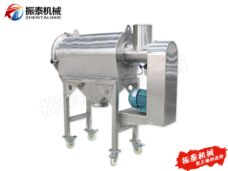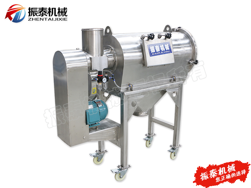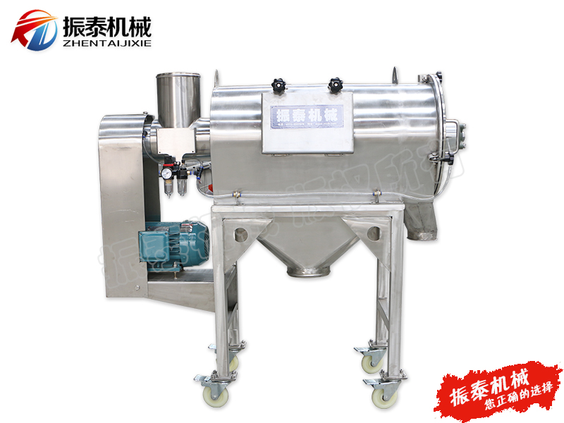 黃原膠氣流篩篩網(wǎng)為圓筒狀,置于機(jī)體內(nèi),物料通過螺旋輸送系統(tǒng)后,和氣流混合、霧化進(jìn)入網(wǎng)筒內(nèi);通過網(wǎng)筒內(nèi)風(fēng)輪葉片使物料同時受離心力和旋風(fēng)推進(jìn)力,從而能使物料噴射過網(wǎng),由細(xì)料排出口排出,不能過網(wǎng)的物料沿網(wǎng)筒壁從粗料排出口排出。