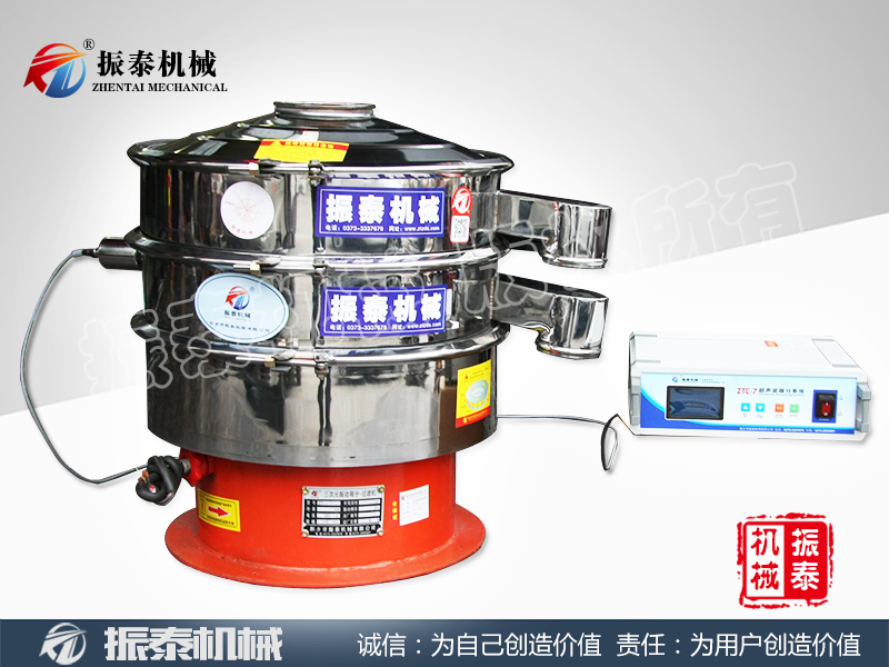 其工作原理是該設備將220V、50Hz或110V、60Hz電能轉化為18KHz的高頻電能,輸入超聲換能器,將其變成18KHz的機械振動,使振動篩達到高效篩分和清網(wǎng)的目的。超聲波振動篩是在傳統(tǒng)振動篩的篩網(wǎng)上安裝了一個低振幅、高頻率的超聲振動波(機械波),超微細粉體接受巨大的超聲加速度,改善低密度粉在重力沉降中的平降(粉末與網(wǎng)口輕接觸)、滑移效應,改善高密度金屬在網(wǎng)口的滯留或楔入,改善帶靜電粉體的粘附效應,從而提高篩分效率和篩分質量,并使篩網(wǎng)表面上的物料始終保持懸浮狀態(tài),從而抑制粘附、摩擦、平降、楔入等堵網(wǎng)因素,最終解決了強吸附性、易團聚、高靜電、高精細、高密度、輕比重等篩分難題,以改善超微細分體的篩分性能,所以,超聲波振動篩特別適合高品質、精細粉體的用戶使用。