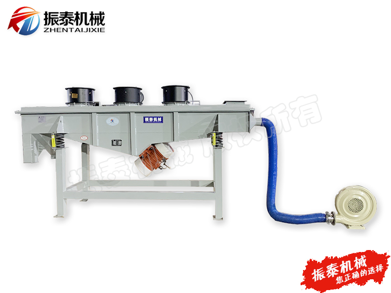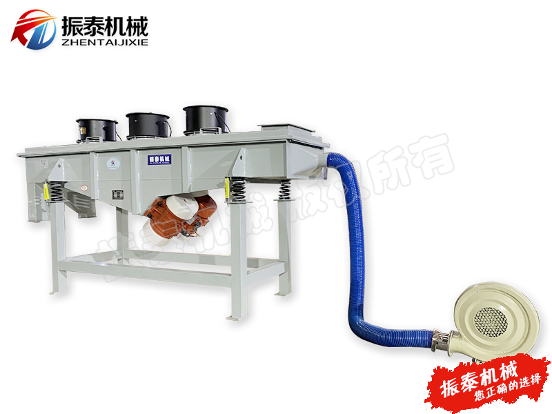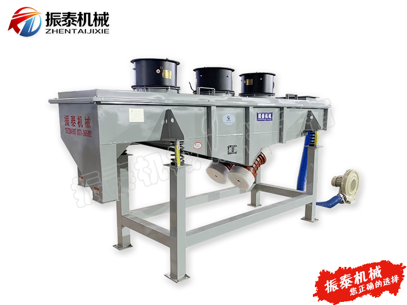 振泰芝麻風(fēng)冷型直線振動(dòng)篩是以ZTSF系列直線振動(dòng)篩為基礎(chǔ),在進(jìn)料口底部或箱體下側(cè)端增加了風(fēng)機(jī)降溫冷卻系統(tǒng),在進(jìn)料口加裝篩網(wǎng)及小型排料口使大顆粒結(jié)塊物料從小型排料口中排出,該裝置可有效攔截大顆粒并緩沖物料對(duì)篩網(wǎng)的沖擊,延長(zhǎng)篩網(wǎng)使用壽命(該裝置針對(duì)部分物料,不需要可去除)。物料在進(jìn)入設(shè)備時(shí),位于進(jìn)料口底部或箱體下側(cè)端的風(fēng)機(jī)降溫冷卻系統(tǒng)對(duì)其進(jìn)行降溫作業(yè),兩臺(tái)振動(dòng)電機(jī)相對(duì)篩面有一傾角,在激振力和物料自重力的合理作用下,降溫后的物料在篩面上被拋起、跳躍式向前做直線運(yùn)動(dòng),通過多層篩網(wǎng)產(chǎn)生書中規(guī)格的篩上物及篩下物,分別從各層的出料口排出,達(dá)到篩選和分級(jí)的目的。